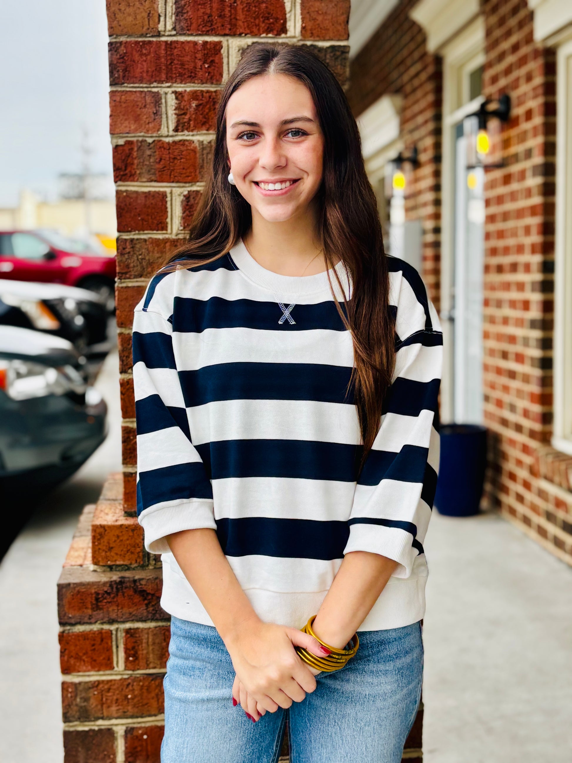 Drop shoulder 3/4 sleeves bold stripe casual top with V-notch.